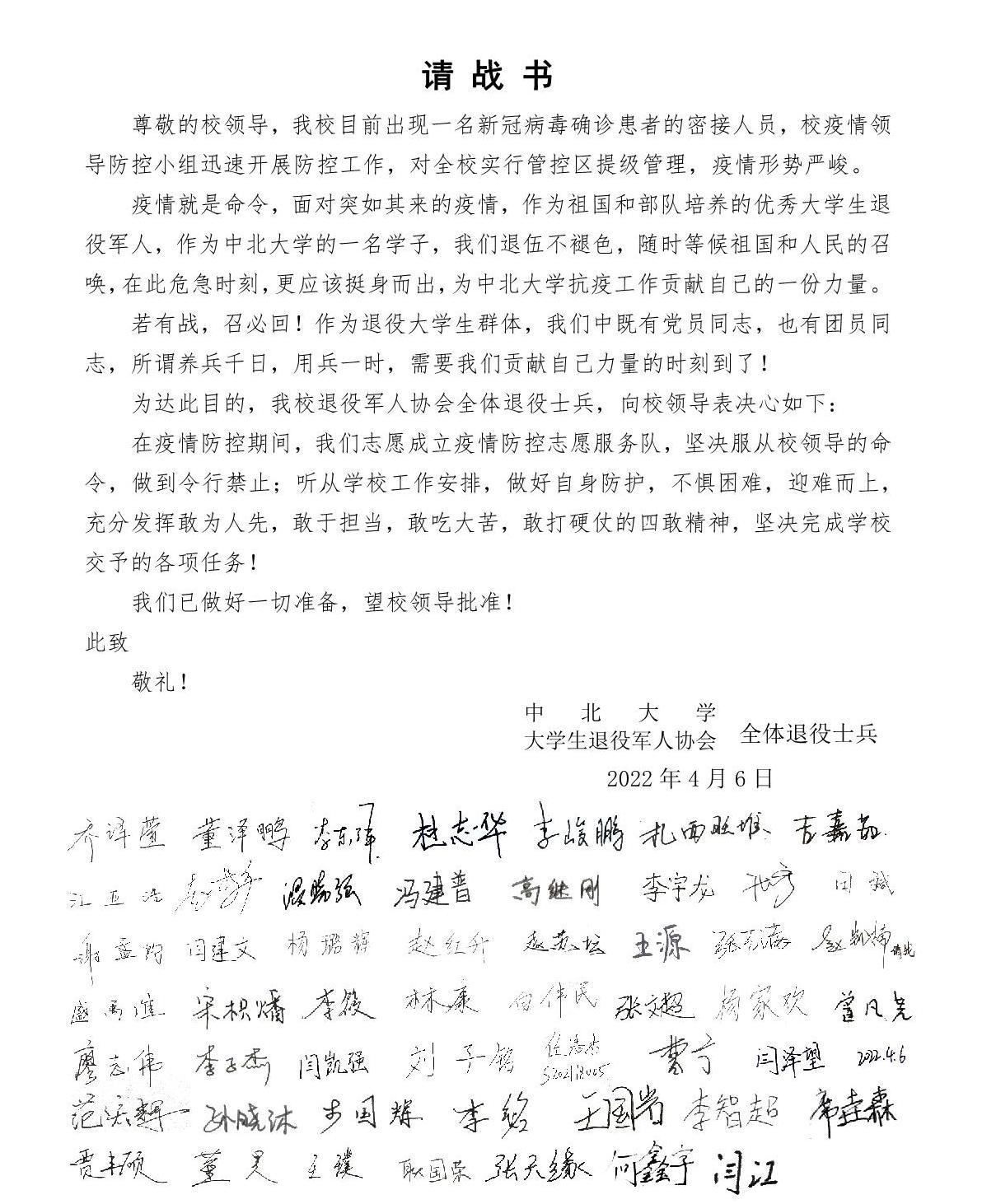 “在疫情防控期间,我们志愿成立疫情防控志愿服务队,坚决服从校领导的命令,做到令行禁止;听从学校工作安排,做好自身防护,不惧困难、迎难而上,充分发挥敢为人先、敢于担当、敢吃大苦、敢打硬仗的四敢精神,坚决完成学校交予的各项任务……”这是一封在疫情防控特殊时期,由51名身份特殊的同学写下的请战书,义无反顾的姿态、掷地有声的话语、铿锵有力的誓言,再一次彰显了中北学子在疫情防控战役中的青年担当与青春力量。4月5日,根据属地政府疫情防控管理要求,对全校实行“管控区”提级管理。在这一特殊时刻,已经返校的51名退役大学生联名向学校提交抗疫请战书,主动请战,发挥了退役大学生在部队历练出来的冲锋在前的光荣传统。