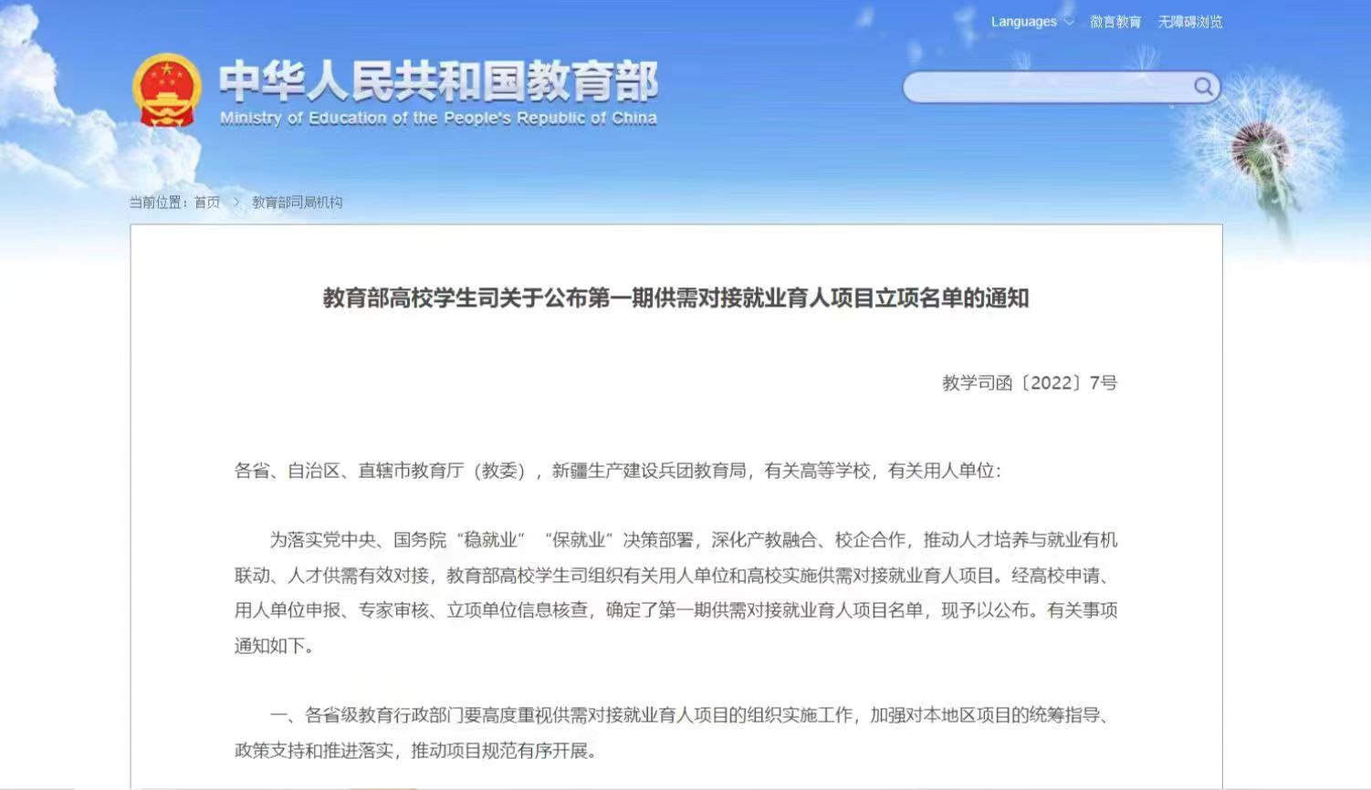 供需对接就业育人项目申报是教育部落实党中央、国务院“稳就业”“保就业”决策部署而推出的重要举措,旨在深化用人单位与高校产教融合、校企合作,推动人才培养与就业有机联动、人才供需有效对接。