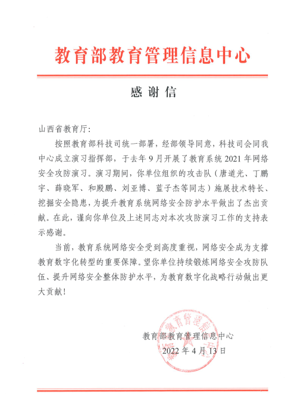近日,我校收到教育部发来的感谢信。来信感谢我校在全国教育系统2021年网络安全攻防演习中提供的重要技术支持,表扬我校师生为提升教育系统网络安全防护水平做出的杰出贡献。