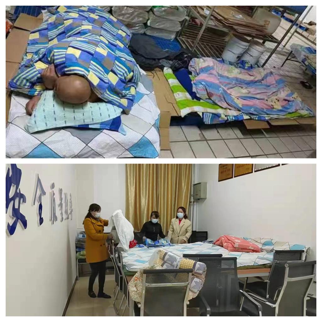 封控期间,由于校内后勤人员有限,临时食宿环境较为艰苦,很多员工都是打地铺、睡桌子,但大家依然乐观坚强,坚守岗位、做好服务,时刻彰显着后勤人默默无闻、吃苦耐劳的优秀品质。