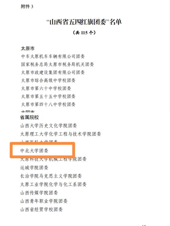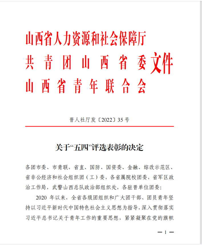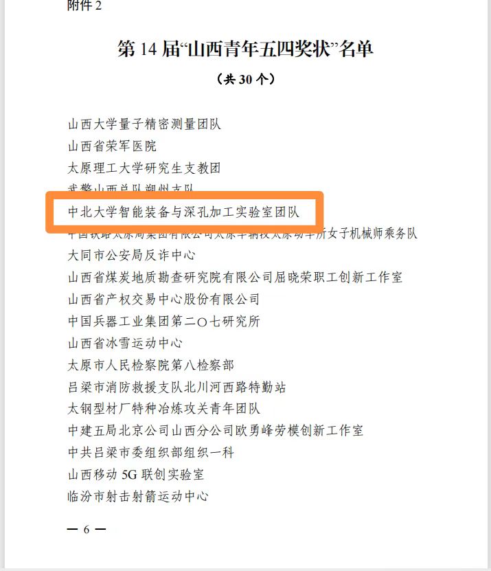 2022年,我们党将召开第二十次全国代表大会,也是中国共青团建团 100 周年。为充分发挥先进典型模范带头作用,激励引导广大团员青年踔厉奋发、砥砺笃行,积极投身我省全方位推动高质量发展生动实践。近日,山西省人力资源和社会保障厅、共青团山西省委、山西省青年联合会共同开展对2021年度做出突出贡献的先进集体与优秀个人的评选表彰。全省30个集体获得第 14 届“山西青年五四奖状”称号,115个团组织获得“山西省五四红旗团委”称号。其中,我校团委荣获“山西省五四红旗团委”称号,智能装备与深孔加工实验室团队荣获第14届“山西青年五四奖状”称号。“山西省五四红旗团委”和“山西青年五四奖状”是团省委授予全省基层团组织和全省优秀青年团队的最高荣誉。