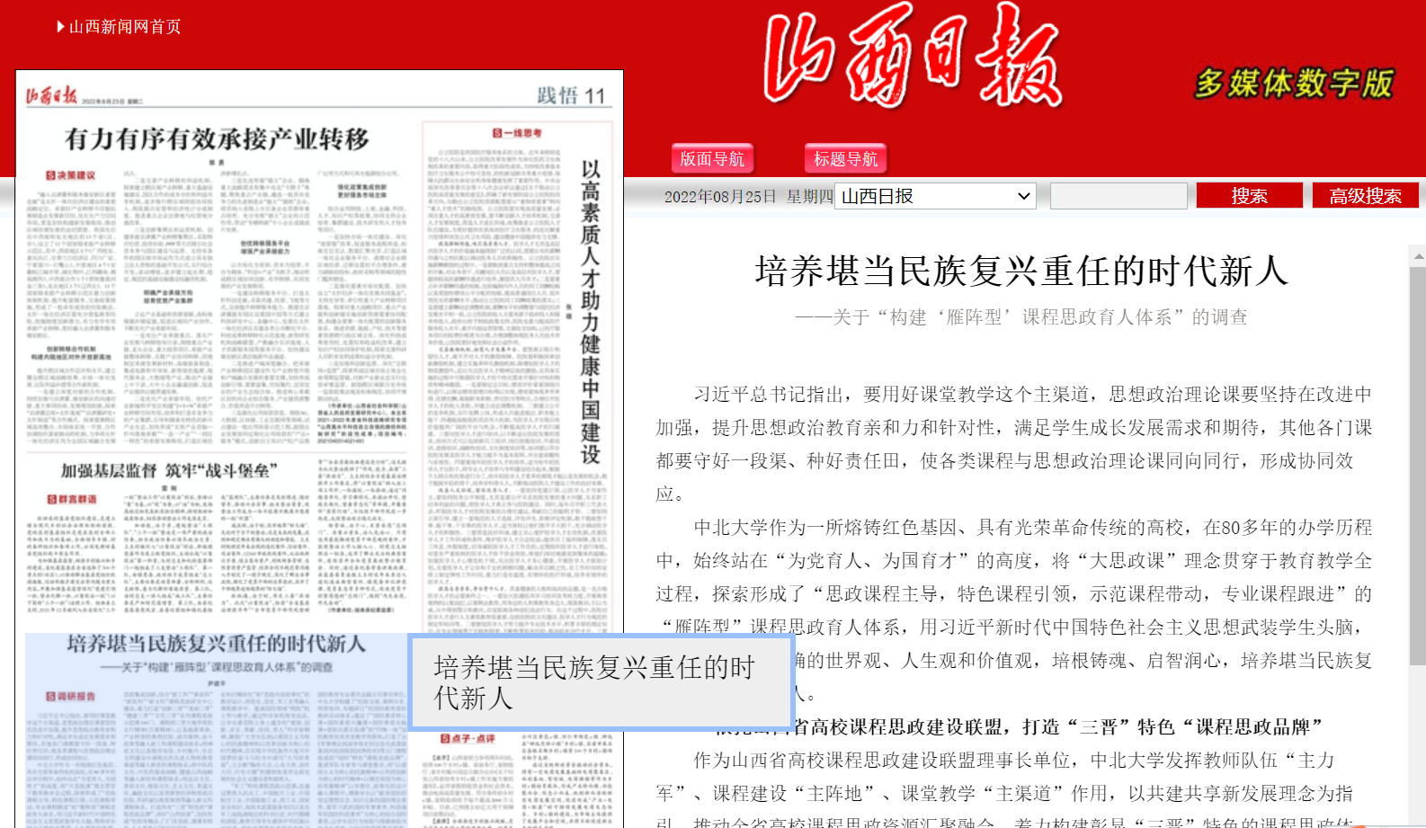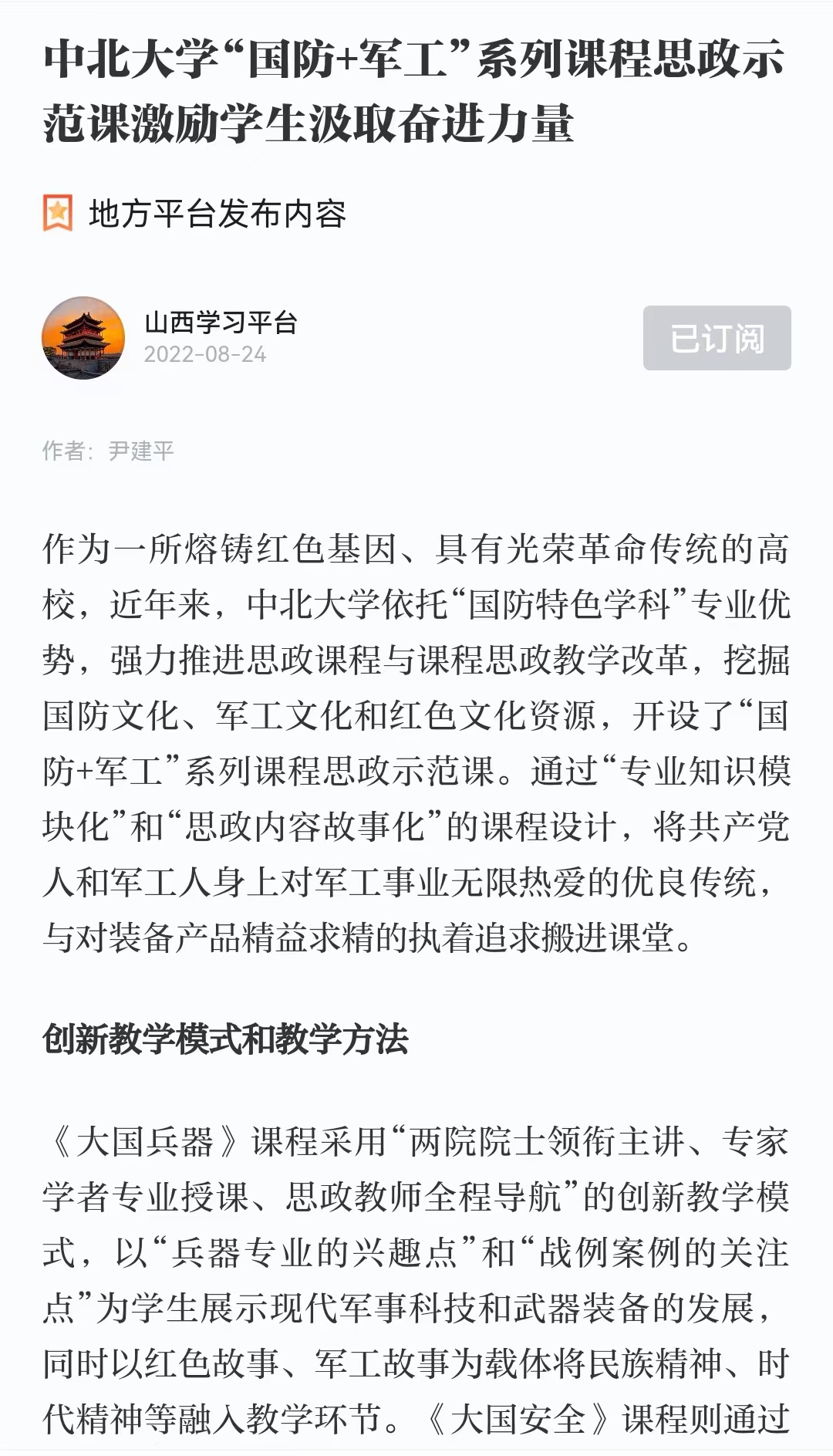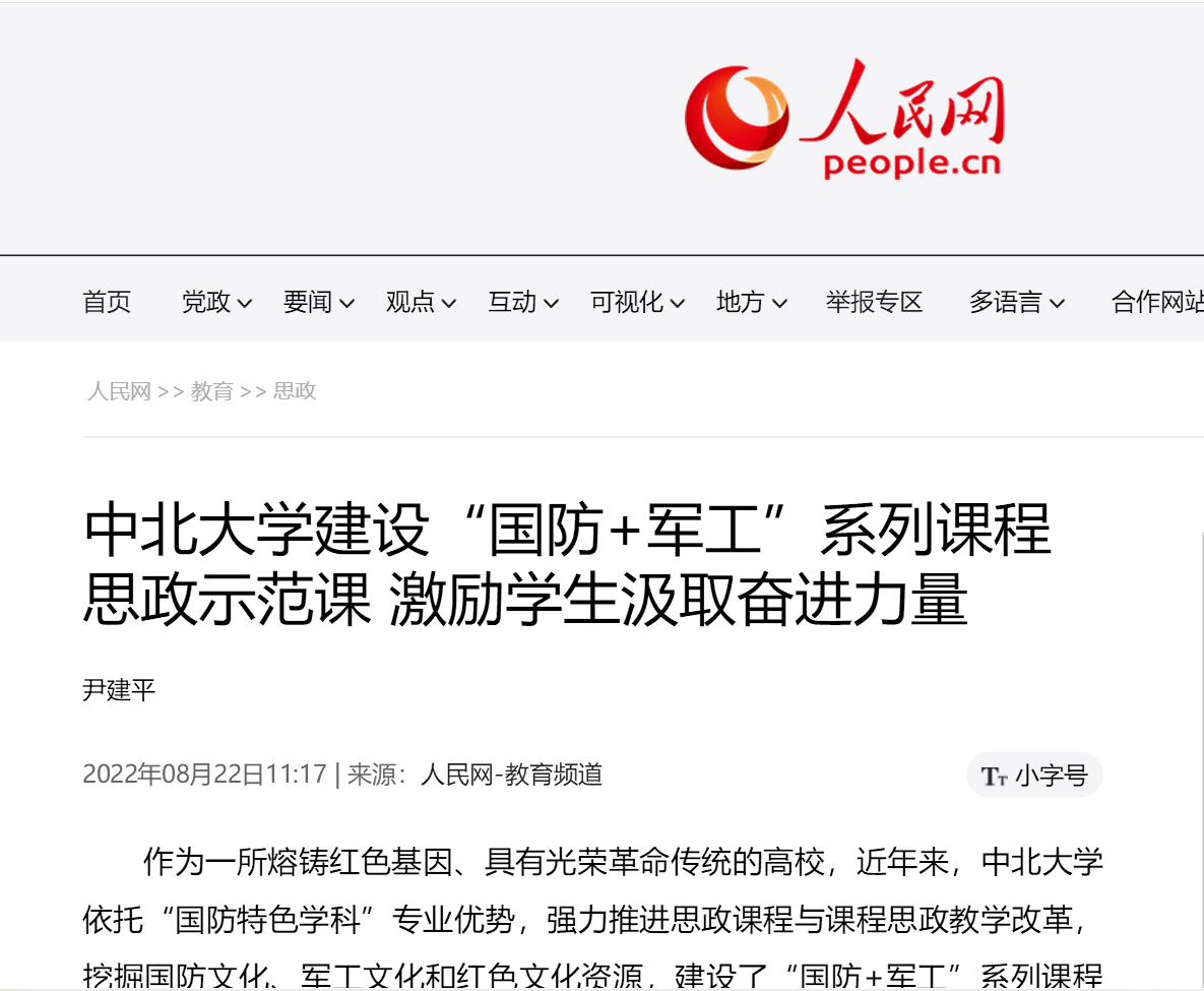 近日,人民网、山西日报、学习强国等媒体从不同角度报道了我校“国防+军工”系列特色课程思政示范课建设成果。